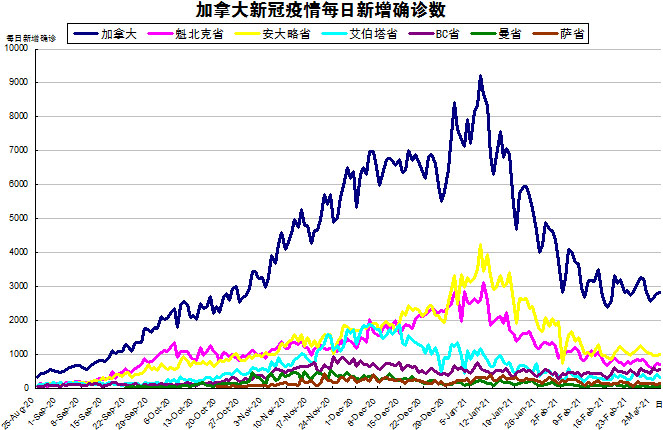 “第二波”疫情目前虽然呈下降趋势,但随着变异新冠病毒开始在社区内传播,疫情随时都会卷土重来,加国生活网小编专门统计了从2020年8月25日至2021年3月4日的五个省份的新增确诊数,并制作了如下曲线图,让大家能一目了然地了解加拿大新冠疫情的发展趋势。加拿大当日新增2832,按新增确诊数由多至少的排列分别是:安省新增994、魁省新增707、BC省新增564、艾省新增331、萨省新增111、曼省新增51。