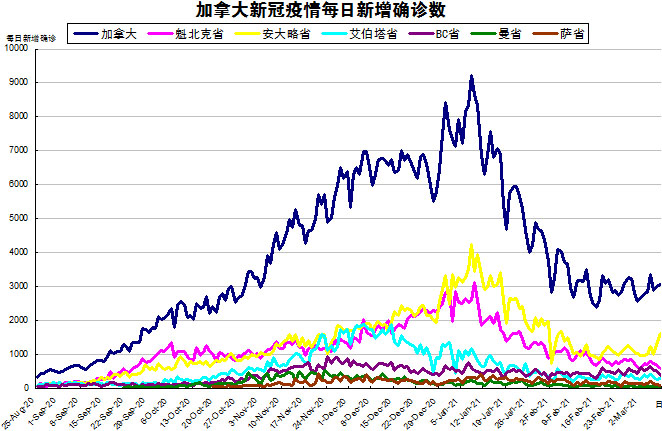 随着周末的结束,BC省和艾省终于更新数据了,加国生活网小编将当天新增的4422例进行了分解。“第二波”疫情目前虽然呈下降趋势,但随着变异新冠病毒开始在社区内传播,疫情随时都会卷土重来,加国生活网小编专门统计了从2020年8月25日至2021年3月8日的五个省份的新增确诊数,并制作了如下曲线图,让大家能一目了然地了解加拿大新冠疫情的发展趋势。加拿大当日新增3041例,按新增确诊数由多至少的排列分别是:安省新增1631、魁省新增579、BC省新增385、艾省新增278、萨省新增97、曼省新增63。