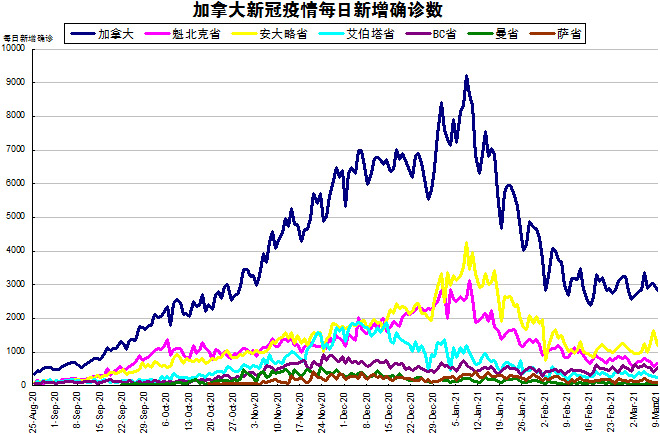 “第二波”疫情目前虽然呈下降趋势,但随着变异新冠病毒开始在社区内传播,疫情随时都会卷土重来,加国生活网小编专门统计了从2020年8月25日至2021年3月9日的五个省份的新增确诊数,并制作了如下曲线图,让大家能一目了然地了解加拿大新冠疫情的发展趋势。加拿大当日新增2822例,按新增确诊数由多至少的排列分别是:安省新增1185、魁省新增650、BC省新增550、艾省新增255、萨省新增112、曼省新增62。