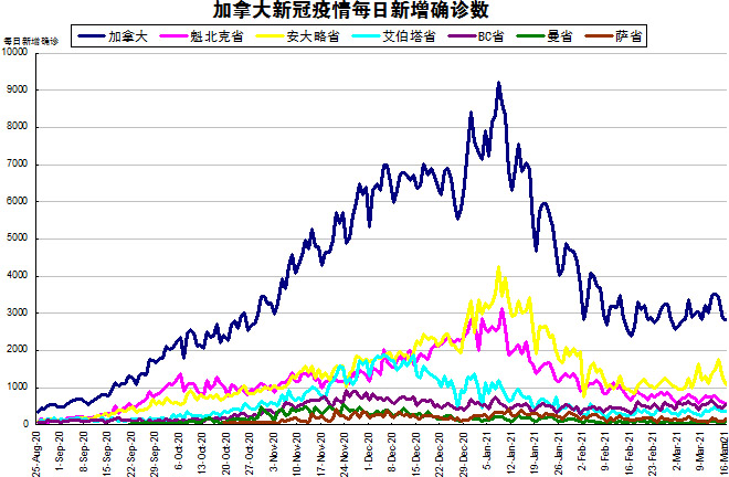 “第二波”疫情目前虽然呈下降趋势,但随着变异新冠病毒开始在社区内传播,“第三波”疫情可能已经开始了,加国生活网小编专门统计了从2020年8月25日至2021年3月16日的五个省份的新增确诊数,并制作了如下曲线图,让大家能一目了然地了解加拿大新冠疫情的发展趋势。加拿大当日新增2821例,按新增确诊数由多至少的排列分别是:安省新增1074、魁省新增561、BC省新增556、艾省新增355、萨省新增156、曼省新增110。