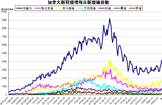 “第二波”疫情目前虽然呈下降趋势,但随着变异新冠病毒开始在社区内传播,“第三波”疫情可能已经开始了,加国生活网小编专门统计了从2020年8月25日至2021年3月19日的五个省份的新增确诊数,并制作了如下曲线图,让大家能一目了然地了解加拿大新冠疫情的发展趋势。加拿大当日新增4221例,按新增确诊数由多至少的排列分别是:安省新增1745、魁省新增764、BC省新增737、艾省新增696、萨省新增174、曼省新增91。