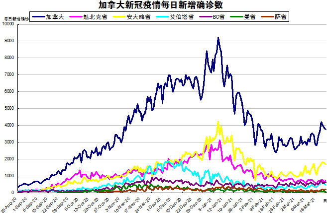 随着周末的结束,BC省终于更新数据了,加国生活网小编将当天新增的4934例进行了分解。“第二波”疫情还未完全结束,但随着变异新冠病毒开始在社区内传播,“第三波”疫情已经开始了,加国生活网小编专门统计了从2020年8月25日至2021年3月22日的五个省份的新增确诊数,并制作了如下曲线图,让大家能一目了然地了解加拿大新冠疫情的发展趋势。加拿大当日新增3780例,按新增确诊数由多至少的排列分别是:安省新增1699、魁省新增712、BC省新增631、艾省新增456、萨省新增205、曼省新增65。
