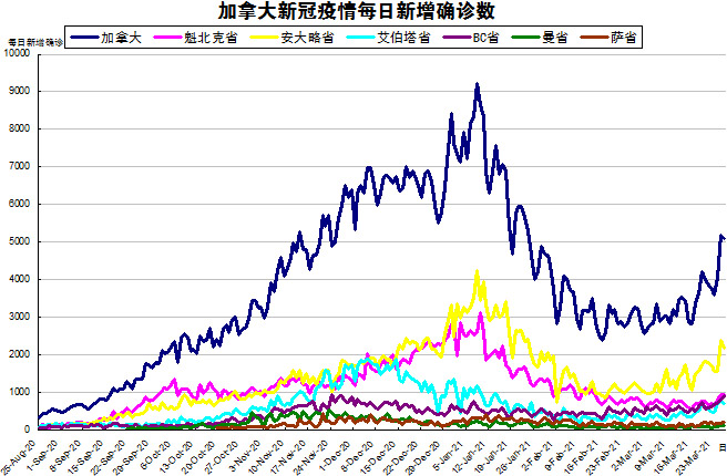 “第二波”疫情还未完全结束,但随着变异新冠病毒开始在社区内传播,“第三波”疫情已经开始了,加国生活网小编专门统计了从2020年8月25日至2021年3月26日的五个省份的新增确诊数,并制作了如下曲线图,让大家能一目了然地了解加拿大新冠疫情的发展趋势。加拿大当日新增5098例,按新增确诊数由多至少的排列分别是:安省新增2169、魁省新增950、BC省新增908、艾省新增717、萨省新增213、曼省新增114。