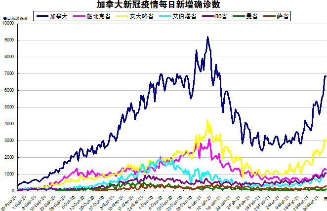 随着Good Friday的结束,各省终于更新数据了,连BC省也在周末更新了数据,加国生活网小编将2天新增的11041例进行了分解。随着变异新冠病毒开始在社区内传播,“第三波”疫情已经开始了,加国生活网小编专门统计了从2020年8月25日至2021年4月3日的五个省份的新增确诊数,并制作了如下曲线图,让大家能一目了然地了解加拿大新冠疫情的发展趋势。加拿大当日新增6849例,按新增确诊数由多至少的排列分别是:安省新增3009、魁省新增1282、艾省新增1100、BC省新增1072、萨省新增280、曼省新增111。这其中,安省是连续第二天超3千例;BC省是连续两天打破了自疫情以来的单日确诊病例数的最高记录,加拿大“第三波”疫情正处于激增状态。