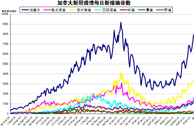 随着变异新冠病毒开始在社区内传播,“第三波”疫情已经开始了,加国生活网小编专门统计了从2020年8月25日至2021年4月8日的五个省份的新增确诊数,并制作了如下曲线图,让大家能一目了然地了解加拿大新冠疫情的发展趋势。加拿大当日新增7984例,按新增确诊数由多至少的排列分别是:安省新增3295、魁省新增1690、艾省省新增1429、BC省新增1293、萨省新增205、曼省新增137。