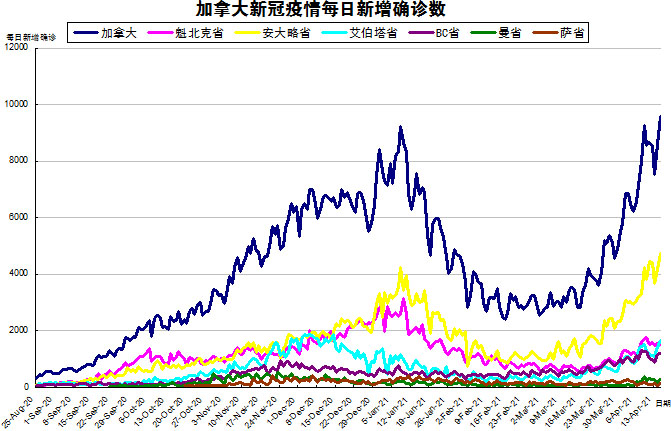 随着变异新冠病毒开始在社区内传播,“第三波”疫情已经开始了,加国生活网小编专门统计了从2020年8月25日至2021年4月15日的五个省份的新增确诊数,并制作了如下曲线图,让大家能一目了然地了解加拿大新冠疫情的发展趋势。加拿大当日新增9561例,按新增确诊数由多至少的排列分别是:安省新增4736、艾省新增1646、魁省新增1513、BC省新增1205、萨省新增299、曼省新增149。