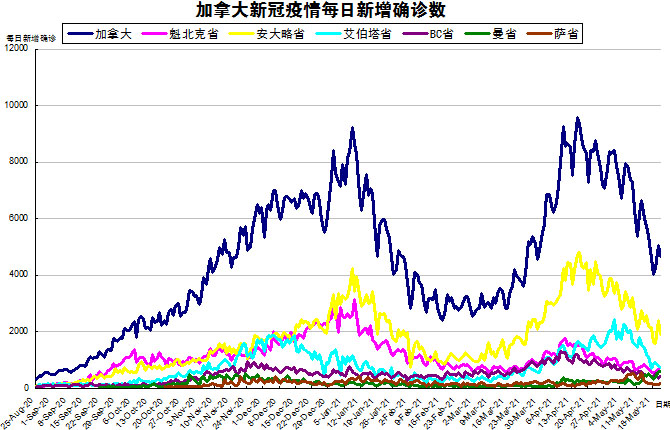 随着变异新冠病毒开始在社区内传播,“第三波”疫情已经开始了,加国生活网小编专门统计了从2020年8月25日至2021年5月21日的五个省份的新增确诊数,并制作了如下曲线图,让大家能一目了然地了解加拿大新冠疫情的发展趋势。加拿大当日新增4676例,按新增确诊数由多至少的排列分别是:安省新增1890、魁省新增752、艾省新增732、曼省新增588、BC省新增420、萨省新增182。