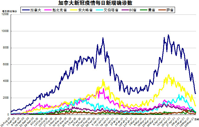 随着变异新冠病毒继续在社区内传播,“第三波”疫情从高峰慢慢下行,加国生活网小编专门统计了从2020年8月25日至2021年5月26日的五个省份的新增确诊数,并制作了如下曲线图,让大家能一目了然地了解加拿大新冠疫情的发展趋势。加拿大当日新增2590例,按新增确诊数由多至少的排列分别是:安省新增1095、艾省新增390、魁省新增308、曼省新增310、BC省新增250、萨省新增181。曼省竟然超过BC省,位列第四了。