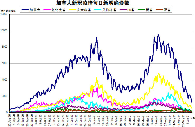 周末结束了,BC省也终于更新数据了,加国生活网小编将当天新增的1582例进行了分解。随着变异新冠病毒继续在社区内传播和疫苗接种工作的展开,“第三波”疫情已从高峰缓慢下行,加国生活网小编专门统计了从2020年8月25日至2021年6月7日的五个省份的新增确诊数,并制作了如下曲线图,让大家能一目了然地了解加拿大新冠疫情的发展趋势。加拿大当日新增1234例,按新增确诊数由多至少的排列分别是:安省新增525、魁省新增193、曼省新增168、BC省新增133、艾省新增127、萨省新增68。