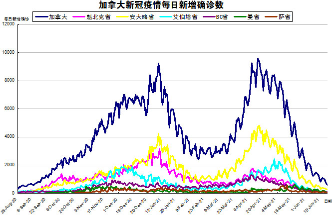 周末结束了,BC省也终于更新数据了,加国生活网小编将当天新增的772例进行了分解。随着变异新冠病毒继续在社区内传播和疫苗接种工作的展开,“第三波”疫情已从高峰缓慢下行,加国生活网小编专门统计了从2020年8月25日至2021年6月21日的五个省份的新增确诊数,并制作了如下曲线图,让大家能一目了然地了解加拿大新冠疫情的发展趋势。加拿大当日新增588例,按新增确诊数由多至少的排列分别是:安省新增270、魁省新增90、曼省新增74、艾省新增60、萨省新增49、BC省新增45。