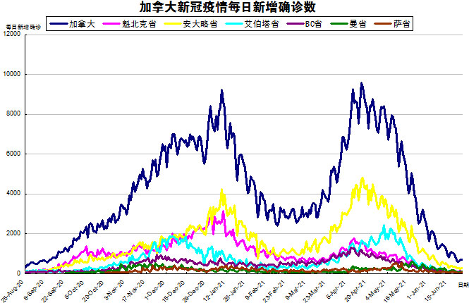 随着变异新冠病毒继续在社区内传播和疫苗接种工作的展开,“第三波”疫情已从高峰缓慢下行,加国生活网小编专门统计了从2020年8月25日至2021年6月24日的五个省份的新增确诊数,并制作了如下曲线图,让大家能一目了然地了解加拿大新冠疫情的发展趋势。加拿大当日新增721例,按新增确诊数由多至少的排列分别是:安省新增296、曼省新增103、魁省新增96、BC省新增75、艾省新增73、萨省新增53。