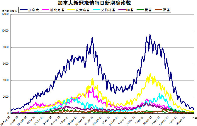 周末结束了,周末停止更新的各个省也终于更新数据了,加国生活网小编将当天新增的801例进行了分解。随着变异新冠病毒继续在社区内传播和疫苗接种工作的展开,“第三波”疫情已从高峰缓慢下行,加国生活网小编专门统计了从2020年8月25日至2021年6月28日的五个省份的新增确诊数,并制作了如下曲线图,让大家能一目了然地了解加拿大新冠疫情的发展趋势。加拿大当日新增438例,按新增确诊数由多至少的排列分别是:安省新增210、魁省新增76、曼省新增61、BC省新增38、艾省新增31、萨省新增17。