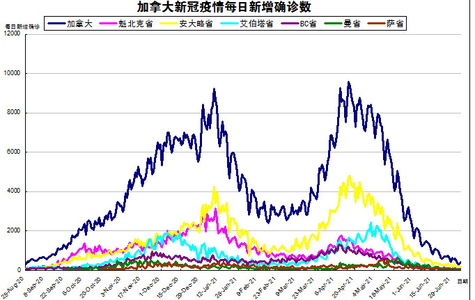 周末结束了,停止更新的一些省份也终于更新数据了,加国生活网小编将当天新增的707例进行了分解。随着变异新冠病毒继续在社区内传播和疫苗接种工作的展开,“第三波”疫情已从高峰缓慢下行,加国生活网小编专门统计了从2020年8月25日至2021年7月5日的五个省份的新增确诊数,并制作了如下曲线图,让大家能一目了然地了解加拿大新冠疫情的发展趋势。加拿大当日新增420例,按新增确诊数由多至少的排列分别是:安省新增170、曼省新增65、魁省新增49、艾省新增44、BC省新增20、萨省新增20。
