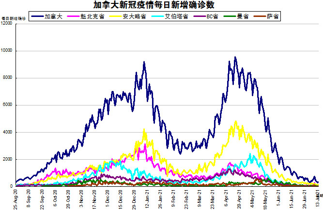 随着变异新冠病毒继续在社区内传播和疫苗接种工作的展开,“第三波”疫情已从高峰缓慢下行,加国生活网小编专门统计了从2020年8月25日至2021年7月13日的五个省份的新增确诊数,并制作了如下曲线图,让大家能一目了然地了解加拿大新冠疫情的发展趋势。加拿大当日新增324例,按新增确诊数由多至少的排列分别是:安省新增146、魁省新增54、艾省新增35、BC省新增33、萨省新增25、曼省新增23。