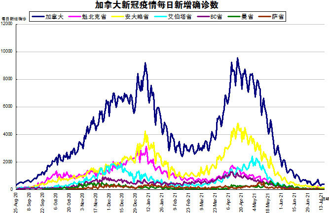 随着变异新冠病毒继续在社区内传播和疫苗接种工作的展开,“第三波”疫情已从高峰缓慢下行,加国生活网小编专门统计了从2020年8月25日至2021年7月16日的五个省份的新增确诊数,并制作了如下曲线图,让大家能一目了然地了解加拿大新冠疫情的发展趋势。加拿大当日新增393例,按新增确诊数由多至少的排列分别是:安省新增159、魁省新增83、BC省新增45、艾省新增41、曼省新增37、萨省新增21。
