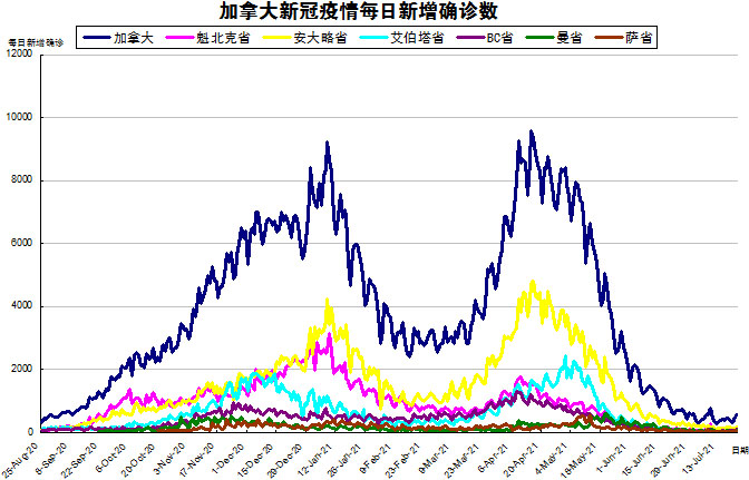 随着变异新冠病毒继续在社区内传播和疫苗接种工作的展开,“第三波”疫情已从高峰缓慢下行,加国生活网小编专门统计了从2020年8月25日至2021年7月22日的五个省份的新增确诊数,并制作了如下曲线图,让大家能一目了然地了解加拿大新冠疫情的发展趋势。加拿大当日新增572例,按新增确诊数由多至少的排列分别是:安省新增185、艾省新增106、魁省新增99、BC省新增89、曼省新增53、萨省新增31。