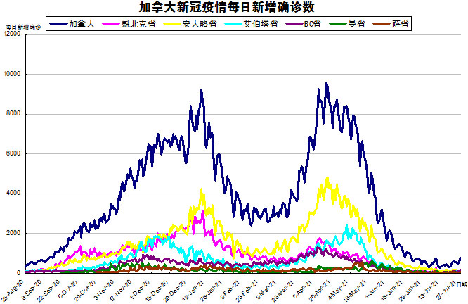 随着Delta变异病毒在社区内传播,再加上各省和地区的卫生限制措施有所放松,“第四波”疫情又有抬头的迹象。加国生活网小编专门统计了从2020年8月25日至2021年7月29日的五个省份的新增确诊数,并制作了如下曲线图,让大家能一目了然地了解加拿大新冠疫情的发展趋势。加拿大当日新增901例,按新增确诊数由多至少的排列分别是:艾省新增233、安省新增218、BC省新增202、魁省新增138、萨省新增52、曼省新增46。