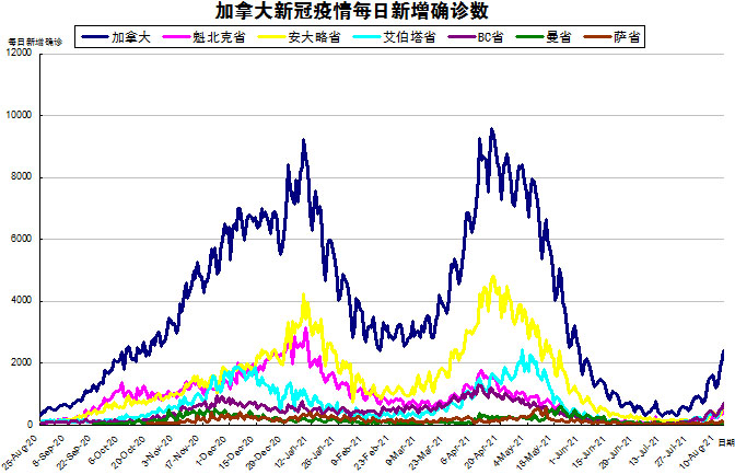 随着Delta变异病毒在社区内传播,再加上各省和地区的卫生限制措施有所放松,“第四波”疫情终于在加拿大全面爆发了。加国生活网小编专门统计了从2020年8月25日至2021年8月13日的五个省份的新增确诊数,并制作了如下曲线图,让大家能一目了然地了解加拿大新冠疫情的发展趋势。加拿大当日新增2405例,按新增确诊数由多至少的排列分别是:BC省新增717、艾省新增582、安省新增510、魁省新增426、萨省新增122、曼省新增21。