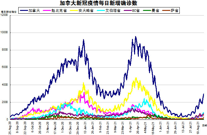 随着Delta变异病毒在社区内传播,再加上各省和地区的卫生限制措施有所放松,“第四波”疫情终于在加拿大开始爆发了。加国生活网小编专门统计了从2020年8月25日至2021年8月20日的五个省份的新增确诊数,并制作了如下曲线图,让大家能一目了然地了解加拿大新冠疫情的发展趋势。加拿大当日新增2951例,按新增确诊数由多至少的排列分别是:艾省新增749、BC省新增663、安省新增650、魁省新增527、萨省新增244、曼省新增42。另外,西北地区疫情爆发,当天新增29例。