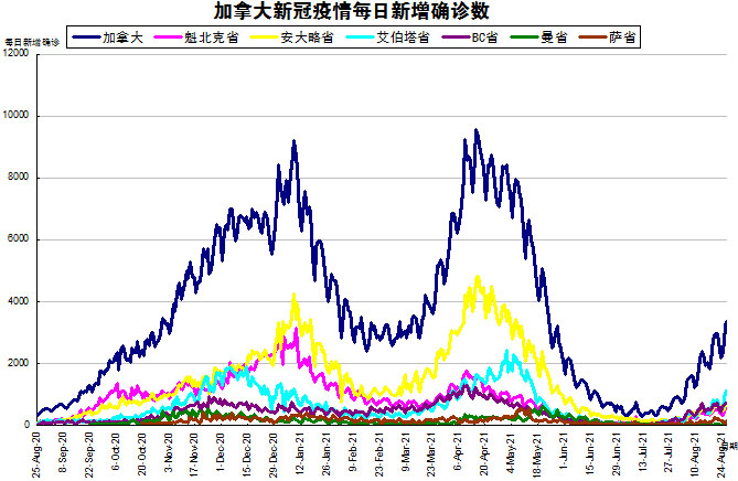 8月25日:艾省在“第四波”疫情中新增确诊病例首次超过1千例 快看加拿大一年疫情发展图表