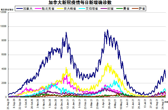 周末终于结束了,停止更新的大部分省份也都终于更新数据了,加国生活网小编将三天新增的7679进行了分解。随着Delta变异病毒在社区内传播,再加上各省和地区的卫生限制措施有所放松,“第四波”疫情终于在加拿大开始爆发了。加国生活网小编专门统计了从2020年8月25日至2021年8月30日的五个省份的新增确诊数,并制作了如下曲线图,让大家能一目了然地了解加拿大新冠疫情的发展趋势。加拿大当日新增2755例,按新增确诊数由多至少的排列分别是:艾省新增865、安省新增694、BC省新增503、魁省新增386、萨省新增201、曼省新增34。另外,西北地区的疫情继续持续增加中,周末三天新增52例。