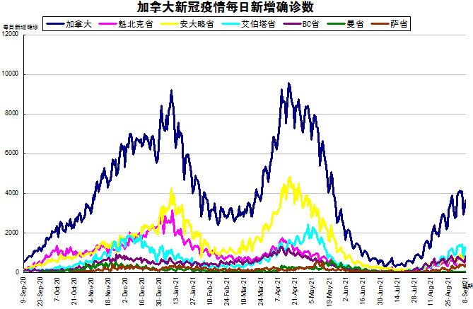 随着Delta变异病毒在社区内传播,再加上各省和地区的卫生限制措施有所放松,“第四波”疫情终于在加拿大开始爆发了。加国生活网小编专门统计了从2020年9月9日至2021年9月8日的五个省份的新增确诊数,并制作了如下曲线图,让大家能一目了然地了解加拿大新冠疫情的发展趋势。加拿大当日新增3653例,按新增确诊数由多至少的排列分别是:艾省新增1166、BC省新增814、魁省新增600、安省新增554、萨省新增405、曼省新增52。
