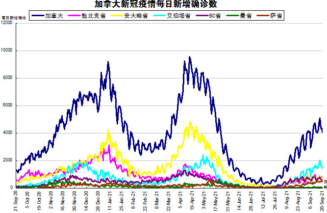 周末终于结束了,停止更新的所有省份也都终于更新数据了,加国生活网小编将3天新增的10173进行了分解。随着Delta变异病毒在社区内传播,再加上各省和地区的卫生限制措施有所放松,“第四波”疫情终于在加拿大开始爆发了。加国生活网小编专门统计了从2020年9月21日至2021年9月20日的五个省份的新增确诊数,并制作了如下曲线图,让大家能一目了然地了解加拿大新冠疫情的发展趋势。加拿大当日新增4051例,按新增确诊数由多至少的排列分别是:艾省新增1436、魁省新增679、安省新增610、萨省新增519、BC省新增442、曼省新增42。另外,新不伦瑞克省周末三天新增199例,涨幅超过了曼省。