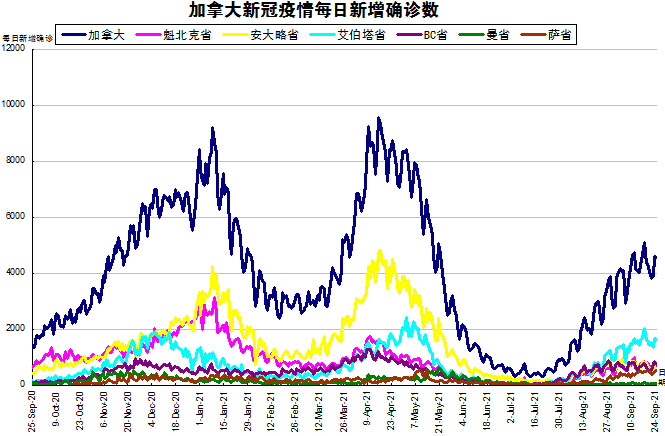 随着Delta变异病毒在社区内传播,再加上各省和地区的卫生限制措施有所放松,“第四波”疫情终于在加拿大开始爆发了。加国生活网小编专门统计了从2020年9月25日至2021年9月24日的五个省份的新增确诊数,并制作了如下曲线图,让大家能一目了然地了解加拿大新冠疫情的发展趋势。加拿大当日新增4569例,按新增确诊数由多至少的排列分别是:艾省新增1651、BC省新增743、安省新增727、魁省新增701、萨省新增527、曼省新增56。另外,新不伦瑞克省新增78例、纽芬兰与拉布拉多新增45例。