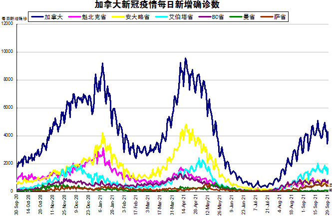 随着Delta变异病毒在社区内传播,再加上各省和地区的卫生限制措施有所放松,“第四波”疫情终于在加拿大开始爆发了。加国生活网小编专门统计了从2020年9月30日至2021年9月29日的五个省份的新增确诊数,并制作了如下曲线图,让大家能一目了然地了解加拿大新冠疫情的发展趋势。加拿大当日新增4279例,按新增确诊数由多至少的排列分别是:艾省新增1682、BC省新增813、魁省新增594、安省新增495、萨省新增394、曼省新增110。