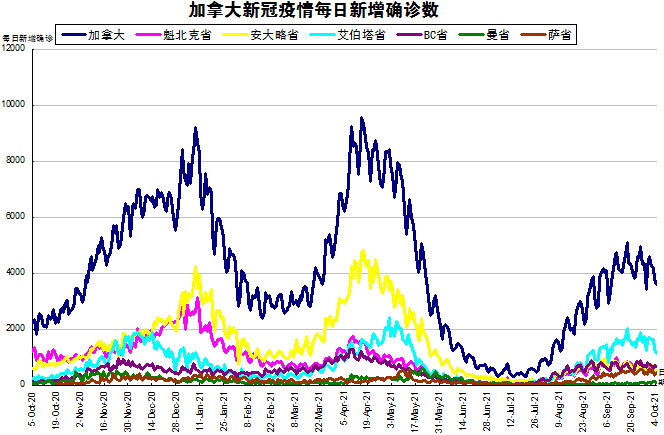 周末终于结束了,停止更新的所有省份也都终于更新数据了,加国生活网小编将3天新增的9210进行了分解。随着Delta变异病毒在社区内传播,再加上各省和地区的卫生限制措施有所放松,“第四波”疫情终于在加拿大开始爆发了。加国生活网小编专门统计了从2020年10月5日至2021年10月4日的五个省份的新增确诊数,并制作了如下曲线图,让大家能一目了然地了解加拿大新冠疫情的发展趋势。加拿大当日新增3595例,按新增确诊数由多至少的排列分别是:艾省新增1126、BC省新增662、安省新增511、萨省新增445、魁省新增402、曼省新增83。