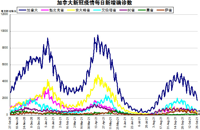 随着Delta变异病毒在社区内传播,再加上各省和地区的卫生限制措施有所放松,“第四波”疫情终于在加拿大开始爆发了。加国生活网小编专门统计了从2020年10月27日至2021年10月26日的五个省份的新增确诊数,并制作了如下曲线图,让大家能一目了然地了解加拿大新冠疫情的发展趋势。加拿大当日新增1748例,按新增确诊数由多至少的排列分别是:BC省新增457、艾省新增442、魁省新增340、安省新增269、萨省新增126、曼省新增70。