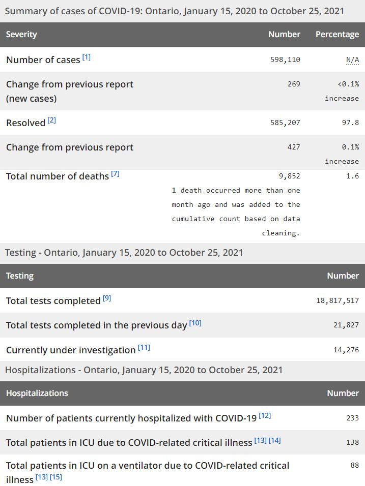 再看看安省方面的详细数据,截止10月25日,安省已对18,817,517例进行了新冠病毒检测(检测数较昨天新增21,827),还有14,276处于被调查阶段。确诊总数598,110(当天新增326;阳性率下降至1.23%),包括585,207例康复(康复率仍为97.8%)、9,852例死亡(增加6例,死亡率仍为1.6%)。住院患者233例(增加70例);进入ICU患者138例(未变);IU插呼吸机患者94(减少6)。