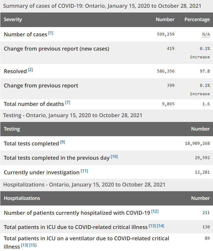 再看看安省方面的详细数据,截止10月28日,安省已对18,909,268例进行了新冠病毒检测(检测数较昨天新增29,592),还有12,281处于被调查阶段。确诊总数599,259(当天新增419;阳性率上升至1.42%),包括586,356例康复(康复率仍为97.8%)、9,865例死亡(增加0例,死亡率仍为1.6%)。住院患者211例(增加14例);进入ICU患者130例(减少2);IU插呼吸机患者89(减少4)。