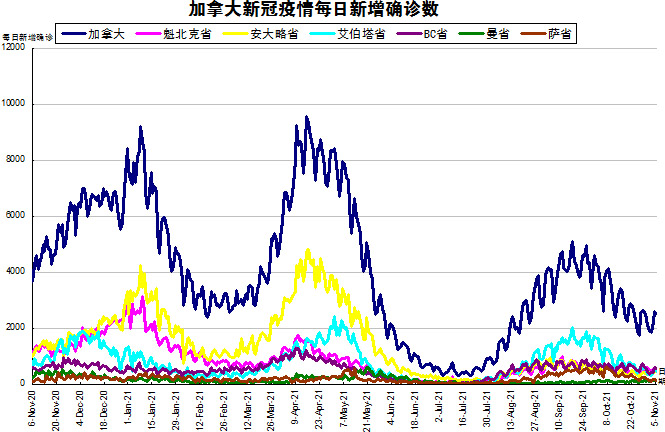 随着Delta变异病毒在社区内传播,再加上各省和地区的卫生限制措施有所放松,“第四波”疫情终于在加拿大开始爆发了。加国生活网小编专门统计了从2020年11月6日至2021年11月5日的五个省份的新增确诊数,并制作了如下曲线图,让大家能一目了然地了解加拿大新冠疫情的发展趋势。加拿大当日新增2534例,按新增确诊数由多至少的排列分别是:魁省新增571、安省新增563、BC省新增549、艾省新增466、萨省新增141、曼省新增126。