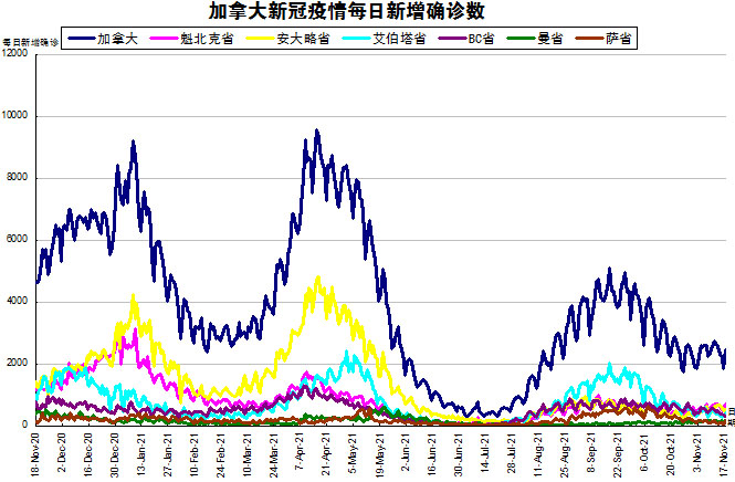 随着Delta变异病毒在社区内传播,再加上各省和地区的卫生限制措施有所放松,“第四波”疫情终于在加拿大开始爆发了。加国生活网小编专门统计了从2020年11月18日至2021年11月17日的五个省份的新增确诊数,并制作了如下曲线图,让大家能一目了然地了解加拿大新冠疫情的发展趋势。加拿大当日新增2442例,按新增确诊数由多至少的排列分别是:魁省新增718、安省新增512、艾省新增412、BC省新增324、萨省新增173、曼省新增153。