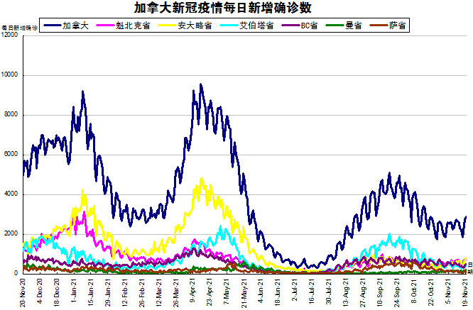 随着Delta变异病毒在社区内传播,再加上各省和地区的卫生限制措施有所放松,“第四波”疫情终于在加拿大开始爆发了。加国生活网小编专门统计了从2020年11月20日至2021年11月19日的五个省份的新增确诊数,并制作了如下曲线图,让大家能一目了然地了解加拿大新冠疫情的发展趋势。加拿大当日新增2886例,按新增确诊数由多至少的排列分别是:安省新增793、魁省新增745、BC省新增486、艾省新增412、曼省新增194、萨省新增88。