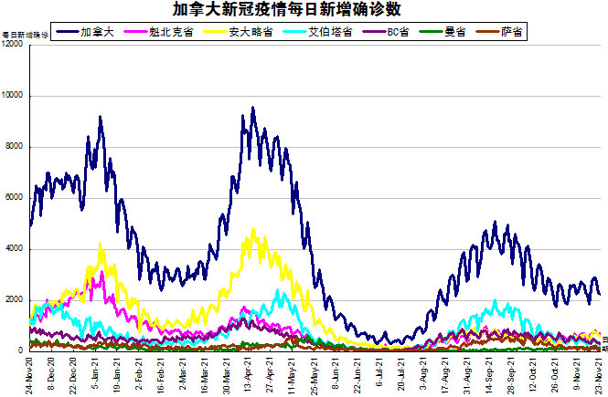 随着Delta变异病毒在社区内传播,再加上各省和地区的卫生限制措施有所放松,“第四波”疫情终于在加拿大开始爆发了。加国生活网小编专门统计了从2020年11月24日至2021年11月23日的五个省份的新增确诊数,并制作了如下曲线图,让大家能一目了然地了解加拿大新冠疫情的发展趋势。加拿大当日新增2228例,按新增确诊数由多至少的排列分别是:魁省新增699、安省新增613、BC省新增324、艾省新增253、曼省新增126、萨省新增68。