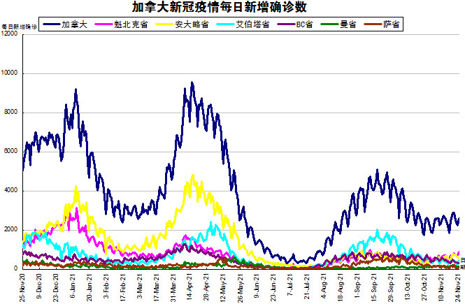 随着Delta变异病毒在社区内传播,再加上各省和地区的卫生限制措施有所放松,“第四波”疫情终于在加拿大开始爆发了。加国生活网小编专门统计了从2020年11月25日至2021年11月24日的五个省份的新增确诊数,并制作了如下曲线图,让大家能一目了然地了解加拿大新冠疫情的发展趋势。加拿大当日新增2616例,按新增确诊数由多至少的排列分别是:魁省新增882、安省新增591、艾省新增464、BC省新增322、曼省新增140、萨省新增90。