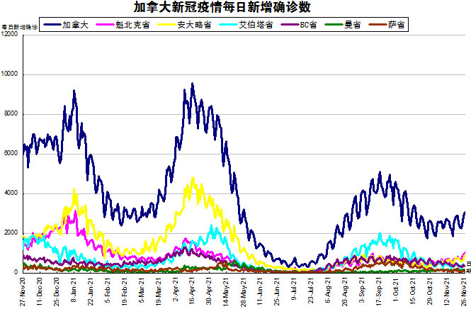 随着Delta变异病毒在社区内传播,再加上各省和地区的卫生限制措施有所放松,“第四波”疫情终于在加拿大开始爆发了。加国生活网小编专门统计了从2020年11月27日至2021年11月26日的五个省份的新增确诊数,并制作了如下曲线图,让大家能一目了然地了解加拿大新冠疫情的发展趋势。加拿大当日新增3053例,按新增确诊数由多至少的排列分别是:魁省新增1037、安省新增927、艾省新增356、BC省新增341、曼省新增145、萨省新增108。魁省在当天又新增了1302例自疫情以来的历史遗漏数据,若加上该数据则当天新增2339例,故将该1302例加在昨天的数据上,以红色的443548例来表示,昨天实际是442246例。