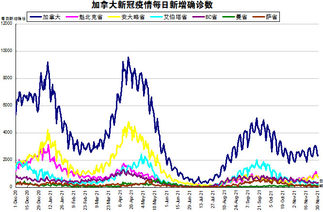 随着Delta变异病毒在社区内传播,再加上各省和地区的卫生限制措施有所放松,“第四波”疫情终于在加拿大开始爆发了。加国生活网小编专门统计了从2020年12月1日至2021年11月30日的五个省份的新增确诊数,并制作了如下曲线图,让大家能一目了然地了解加拿大新冠疫情的发展趋势。加拿大当日新增2357例,按新增确诊数由多至少的排列分别是:魁省新增784、安省新增687、BC省新增358、艾省新增238、曼省新增124、萨省新增42。