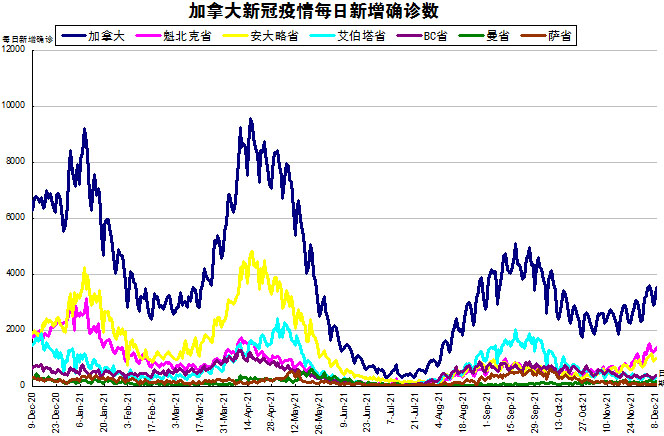 随着Omicron在加拿大出现以及Delta变异病毒继续在社区内传播,“第四波”疫情继续在加拿大延续着。加国生活网小编专门统计了从2020年12月9日至2021年12月8日的五个省份的新增确诊数,并制作了如下曲线图,让大家能一目了然地了解加拿大新冠疫情的发展趋势。加拿大当日新增3543例,按新增确诊数由多至少的排列分别是:魁省新增1367、安省新增1009、艾省新增388、BC省新增379、曼省新增175、新不伦瑞克省新增111(未在下图显示)、萨省新增48。