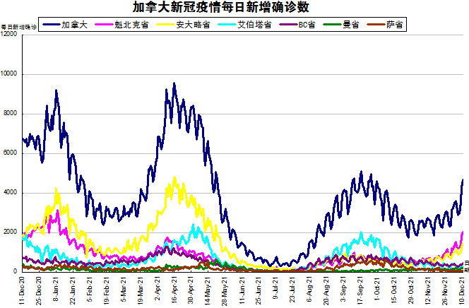 随着Omicron在加拿大出现以及Delta变异病毒继续在社区内传播,“第四波”疫情继续在加拿大延续着。加国生活网小编专门统计了从2020年12月11日至2021年12月10日的五个省份的新增确诊数,并制作了如下曲线图,让大家能一目了然地了解加拿大新冠疫情的发展趋势。加拿大当日新增4675例,按新增确诊数由多至少的排列分别是:魁省新增2013、安省新增1453、BC省新增437、艾省新增287、曼省新增193、新不伦瑞克省新增143(未在下图显示)、萨省新增74。