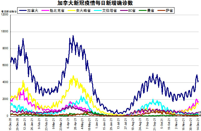 随着Omicron在加拿大出现以及Delta变异病毒继续在社区内传播,“第四波”疫情继续在加拿大延续着。加国生活网小编专门统计了从2020年12月15日至2021年12月14日的五个省份的新增确诊数,并制作了如下曲线图,让大家能一目了然地了解加拿大新冠疫情的发展趋势。加拿大当日新增4224例,按新增确诊数由多至少的排列分别是:魁省新增1747、安省新增1429、BC省新增519、艾省新增250、曼省新增161、新不伦瑞克省新增109(未在下图显示)、萨省新增47。