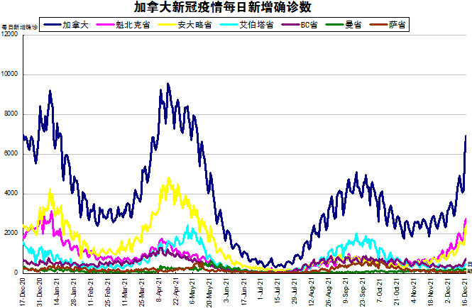 随着Omicron在加拿大在社区内传播,“第四波”疫情再起波澜。加国生活网小编专门统计了从2020年12月17日至2021年12月16日的五个省份的新增确诊数,并制作了如下曲线图,让大家能一目了然地了解加拿大新冠疫情的发展趋势。加拿大当日新增6942例,按新增确诊数由多至少的排列分别是:魁省新增2736、安省新增2421、BC省新增753、艾省新增473、曼省新增211、新不伦瑞克省新增177(未在下图显示)、萨省新增54。