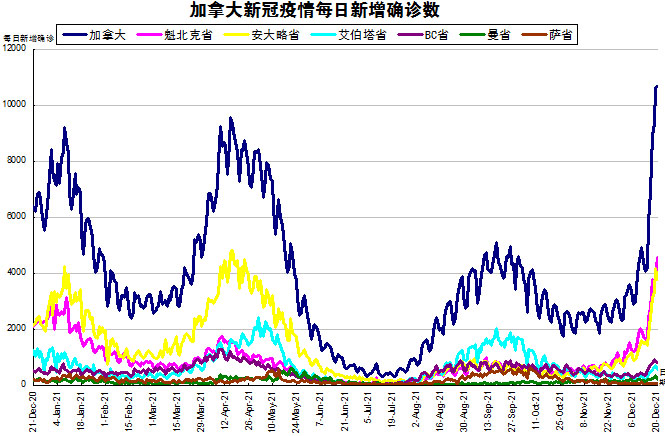 周末终于结束了,停止更新的所有省份也都终于更新数据了,加国生活网小编将3天新增的14382(上周末三天新增5817例)进行了分解。随着Omicron在加拿大在社区内传播,“第四波”疫情再起波澜。加国生活网小编专门统计了从2020年12月21日至2021年12月20日的五个省份的新增确诊数,并制作了如下曲线图,让大家能一目了然地了解加拿大新冠疫情的发展趋势。加拿大当日新增10682例,创自疫情以来的最高单日记录,“第二波”疫情的最高记录是1月8日的9214例,“第三波”疫情是4月15日的9561例。按新增确诊数由多至少的排列分别是:魁省新增4571、安省新增3784、BC省新增807、艾省新增577、新斯科舍省新增485(未在下图显示)、曼省新增200、新不伦瑞克省新增118(未在下图显示)、萨省新增59。
