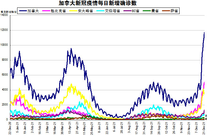 随着Omicron在加拿大在社区内传播,“第四波”疫情再起波澜,加拿大终于改口称其为“第五波”疫情。加国生活网小编专门统计了从2020年12月22日至2021年12月21日的五个省份的新增确诊数,并制作了如下曲线图,让大家能一目了然地了解加拿大新冠疫情的发展趋势。加拿大当日新增11688例,再创自疫情以来的最高单日记录。按新增确诊数由多至少的排列分别是:魁省新增5043、安省新增3453、BC省新增1308、艾省新增786、新斯科舍省新增522(未在下图显示)、曼省新增298、新不伦瑞克省新增156(未在下图显示)、萨省新增67。