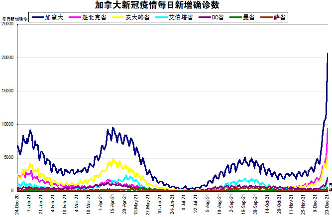 —— 加拿大在12月23日新增20699例确诊病例,不仅四创自疫情以来的最高纪录,而且还是首次突破2万例大关!!加拿大好几个省份包括BC省、安省、魁省、新斯科舍省、新不伦瑞克省和爱德华王子岛的确诊病例都在当天创历史新高。