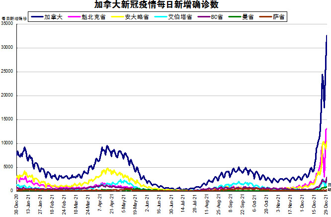 圣诞假期终于结束了,停止更新的所有省份也都终于更新数据了,加国生活网小编将这些天的数据进行了分解。随着Omicron在加拿大在社区内传播,“第五波”疫情在加拿大彻底大爆发。加国生活网小编专门统计了从2020年12月30日至2021年12月29日的五个省份的新增确诊数,并制作了如下曲线图,让大家能一目了然地了解加拿大新冠疫情的发展趋势。按新增确诊数由多至少的排列分别是:魁省新增13149、安省新增10436、BC省新增2940、艾省新增2775、曼省新增946、新斯科舍省新增586(未在下图显示)、新不伦瑞克省新增486(未在下图显示)、萨省新增297。