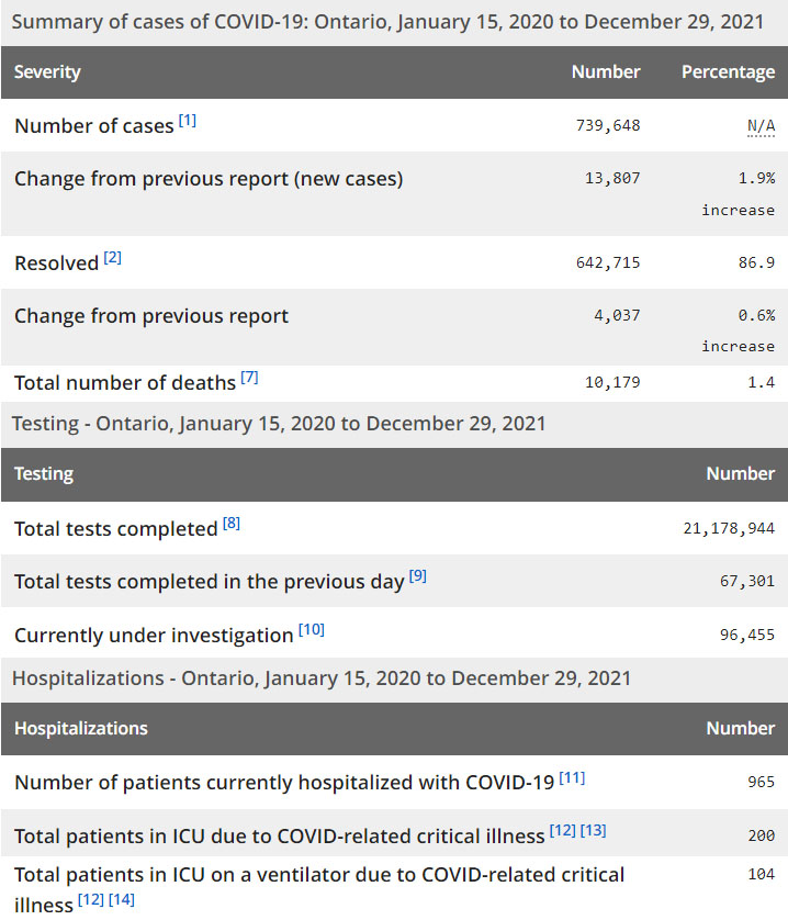 再看看安省方面的详细数据,截止12月29日,安省已对21,178,944例进行了新冠病毒检测(检测数较昨天新增67,301),还有96,455处于被调查阶段。确诊总数739,648(当天新增13,807;阳性率上升至20.5%),包括642,715例康复(康复率下降为86.9%)、10,179例死亡(增加8例,死亡率仍为1.4%)。住院患者965例(增加236);进入ICU患者200例(增加10);IU插呼吸机患者104(未变)。另:多伦多各个社区的疫情地图请点击这里。