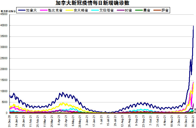 —— 由Omicron变异病毒所引发的疫情12月30日继续在加拿大多个省份造成创纪录单日新增确诊病例数,当日全国新增确诊病例近4万达39772例,其中魁省和安省均“贡献”1.4万左右。